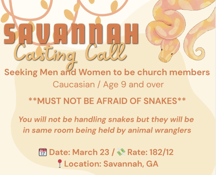 CASTING INFORMATION: SUBMISSION DEADLINE 3/20/2026 Seeking men, women, and children to be church members Requirements: Caucasian / Age 9+ **Must NOT be afraid of snakes** You will not be handling snakes, but they will be in the same room, being held by animal wranglers. 📅 Date 3/23 💸 Rate $182/12 📍Location Savannah, GA If you are interested in learning more, please submit with the guidelines below. Share behind-the-scenes photos of you at the casting! Tag us on socials IG @barbizonmodel , @barbizonmodels , or Barbizon USA |