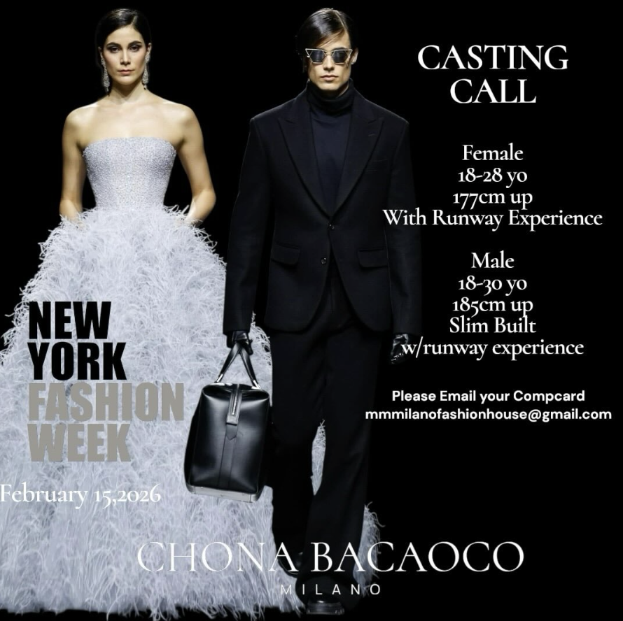 TALENT REQUIREMENTS: Seeking Male and Female models for a fashion show with Chona Bacaoco Milano! Casting Call: Female Ages: 18 – 28 5’8+ runway experience Male Ages: 18 – 30 6ft + slim build runway experience Models will be selected through a casting call audition (runway walk + posing). If chosen, you may be featured in the Galactic Garden Gala fashion show, gaining portfolio-worthy photos, exposure, feedback to sharpen your walk, and valuable networking connections — the perfect stepping stone for serious models looking to grow.