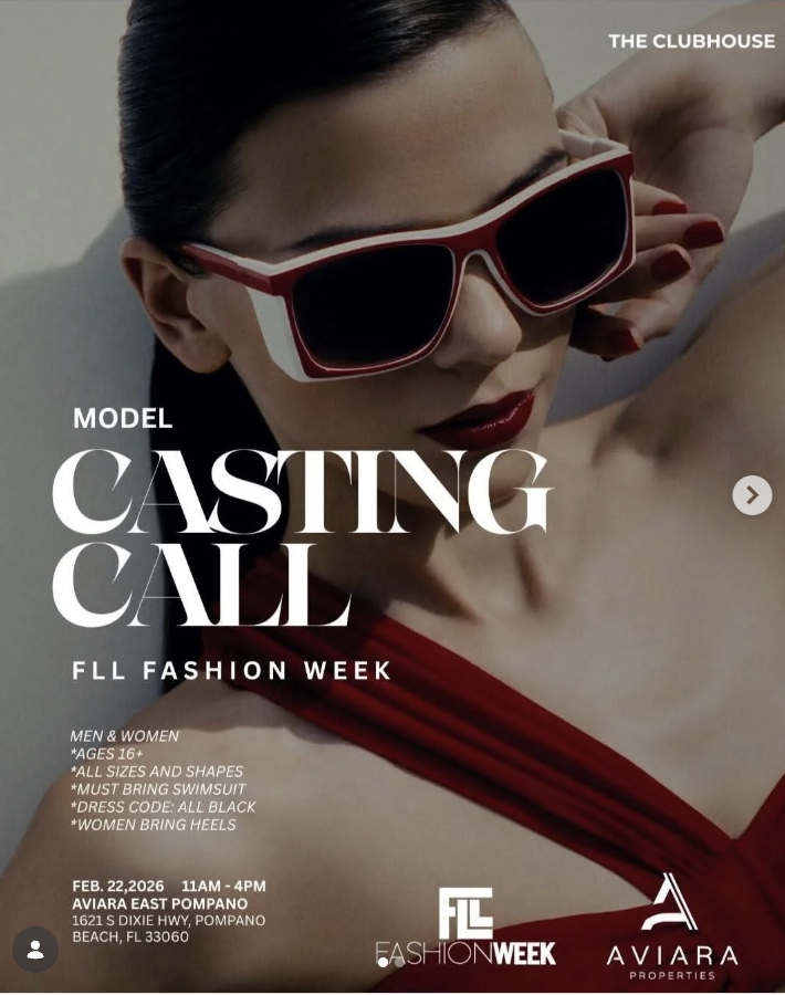 TALENT REQUIREMENTS: CALLING ALL SOUTH FLORIDA MODELS! Fort Lauderdale Fashion Week Model Casting Call!! IN-PERSON CASTING: 📅 Date February 22, 2026 ⏰ 11:00 AM to 5:00 PM Casting Location 📍Pompano Beach, FL (SPECIFICS PROVIDED UPON SUBMISSION) FLL Fashion Week Model Casting Requirements: Male & Female 16 years or older Height Females: All Shapes Height Males: All shapes Bring a photo or Comp card Models must be available April 16th, 17th and 18th THERE WILL BE ONLY ONE DAY OF MODEL CASTING Attire: ALL BLACK (no logos on shirts) Women: Stiletto Heels (no platforms, no wedges) | Tank Top | jeans or leggings Men: Casual Shoe or Gym Shoe | Fitted T-Shirt | Jeans or Slacks