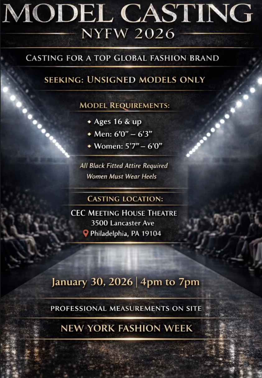 Warrior Model Management is seeking new faces for this season of New York Fashion Week! 📷 MODEL REQUIREMENTS: MODEL CASTING — NYFW 2026 ✨ Casting in Philadelphia, selecting new faces for a prestigious global brand presenting at New York Fashion Week. We are seeking unsigned models only with a strong runway presence. Model Requirements: • Ages 18–25 • Men: 6’0” – 6’3” • Women: 5’7” – 6’0” 📐 All models will be professionally measured upon arrival Casting Attire (Required): • All-black fitted clothing • Women must wear heels This is an exclusive opportunity to be introduced to a major fashion brand on a global stage.